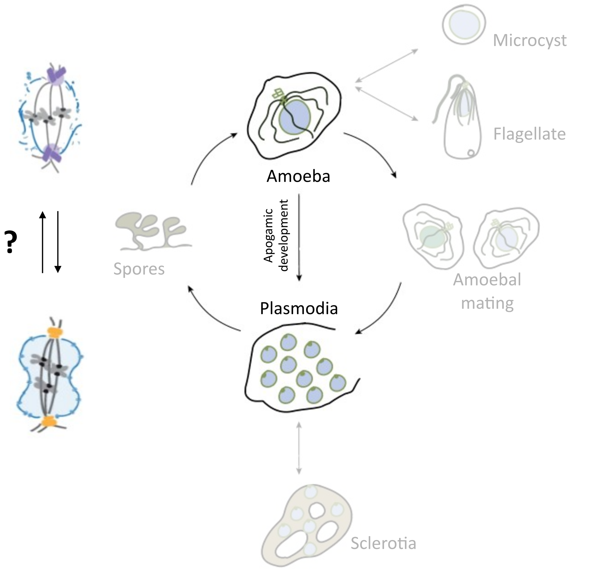 To address these questions, we will take a comparative approach using two evolutionarily distant unicellular eukaryotes, the free-living slime mold Physarum polycephalum and the malaria parasite Plasmodium falciparum, which both have multinucleated life stages. We will compare the plasticity of nuclear cycling in these organism by using a combination of spatial transcriptomics, high-resolution imaging, basic cell biology techniques, and molecular genetics.